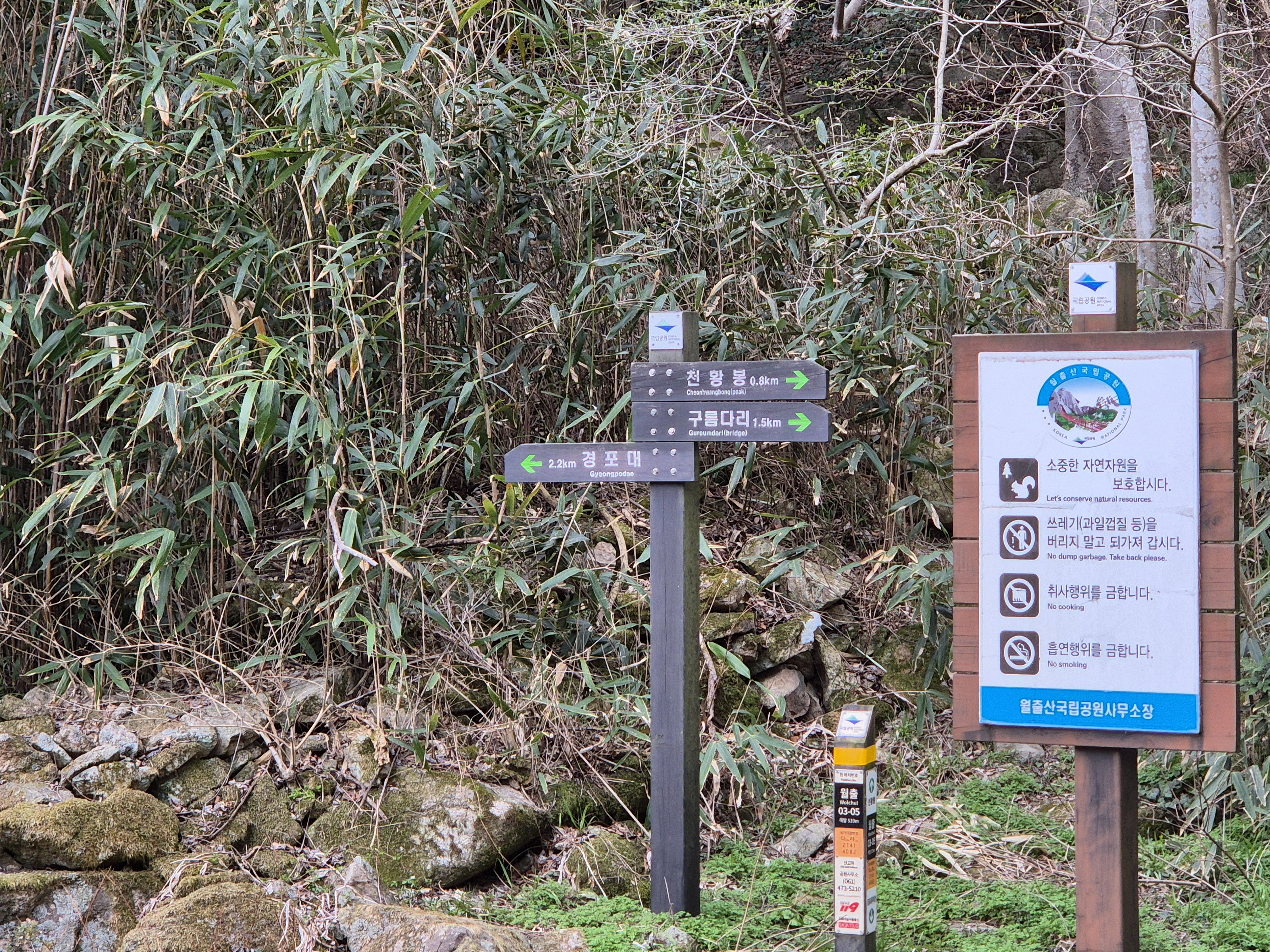 약수터에 도착, 약수는 먹을수없다고 써있다. 여기서부터 조망이 조금씩 보인다. 구름다리 이정표도 보이는데, 월출산 코스중 구름다리로 해서 오는코스가 가장 대중적이다. 경포대능선에서 그쪽에서 오는 산객들과 만난다.